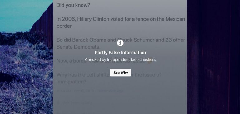 However, the screenshot is being hidden behind a warning message that says “Partly False” and encourages people to visit the website of third-party fact-checker PolitiFact to “See Why.”